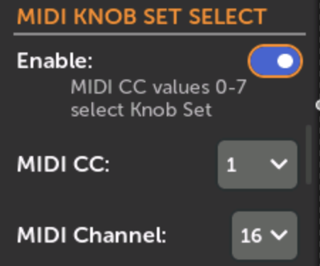 MIDI CC Knob Set switching lets you change the active Knob Set with a single MIDI CC message. When enabled, choose a MIDI Channel and CC# — sending a value of 0–7 on that channel and CC# will immediately switch to the 1st through 8th Knob Set (CC value 0 → Knob Set 1, 1 → Knob Set 2, …, 7 → Knob Set 8).