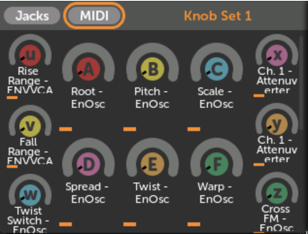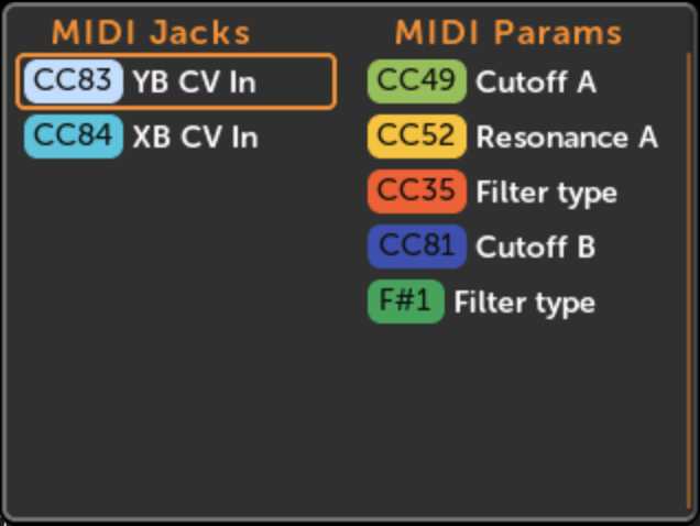 Note that while you can only map MIDI CC and Note Gates to parameters, you can map any MIDI message to input jacks: see MIDI Input Jacks.